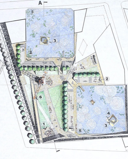 The footprints of the towers are marked by reflecting pools, each with a island chapel in which are interred the human remains found on the site.
