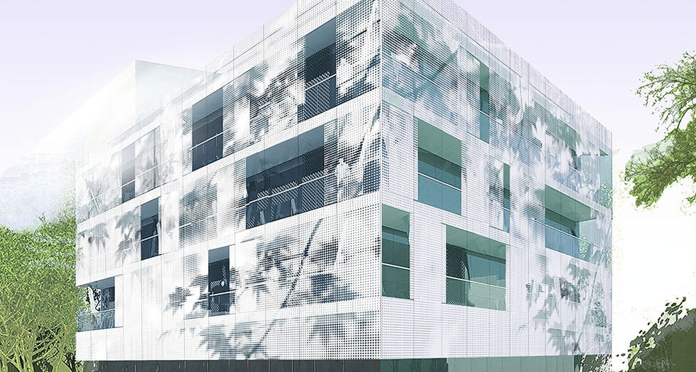 HQ for Hadi Teherani India. Design office, exhibition space and rooftop garden. An Innovative and very reductive "German" design. Includes a " chilled slab" radiant cooling system and state of the art double wall exterior curtain wall. Outer curtain wall is comprised of movable perforated metal panels to shade glazing from the tropical sun.